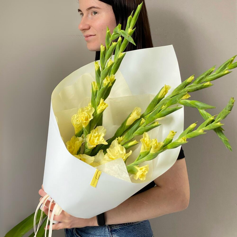 Лента - 3 шт. Тишью - 1 шт. Упаковка дизайнерская - 1 шт. Гладиолус желтый - 5 шт.