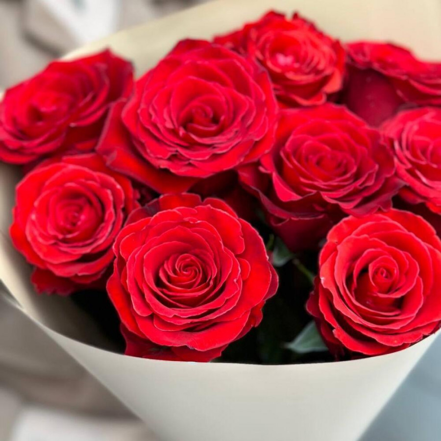 На фото букет из 9 красных роз. В составе: роза 9 шт, крафт-бумага 1 шт, атласная лента 1 шт, . Все цветы свежие и ароматные, букет красиво оформлен и отлично подходит для подарка. Доступна доставка цветов или самовывоз.