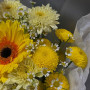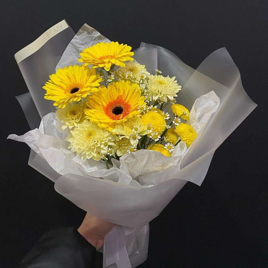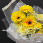 На фото букет из 3 гербер и хризантем. В составе: гербера 3 шт, хризантема кустовая 2 шт, танацетум 1 шт, крафт-бумага 1 шт, атласная лента 1 шт, . Все цветы свежие и ароматные, букет красиво оформлен и отлично подходит для подарка. Доступна доставка цветов или самовывоз.