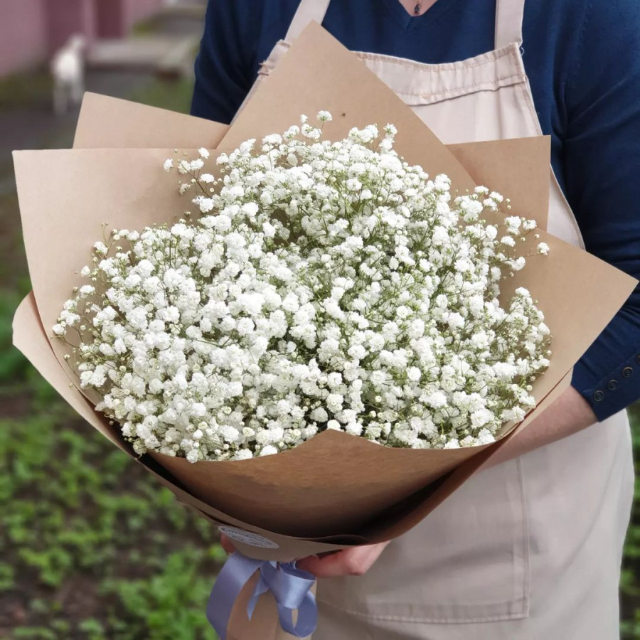На фото букет из 7 белых гипсофил. В составе: гипсофила 7 шт, крафт-бумага 1 шт, атласная лента 1 шт, . Все цветы свежие и ароматные, букет красиво оформлен и отлично подходит для подарка. Доступна доставка цветов или самовывоз.