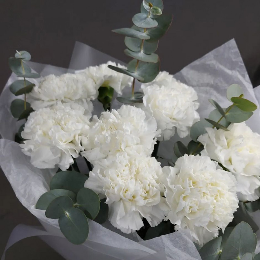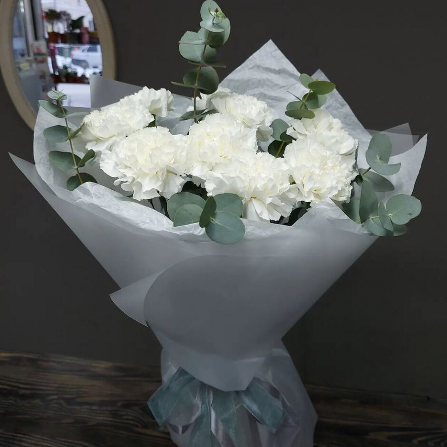 На фото букет из 7 белых гвоздик . В составе: гвоздика 9 шт, эвкалипт 3 шт, крафт-бумага 1 шт, атласная лента 1 шт, . Все цветы свежие и ароматные, букет красиво оформлен и отлично подходит для подарка. Доступна доставка цветов или самовывоз.