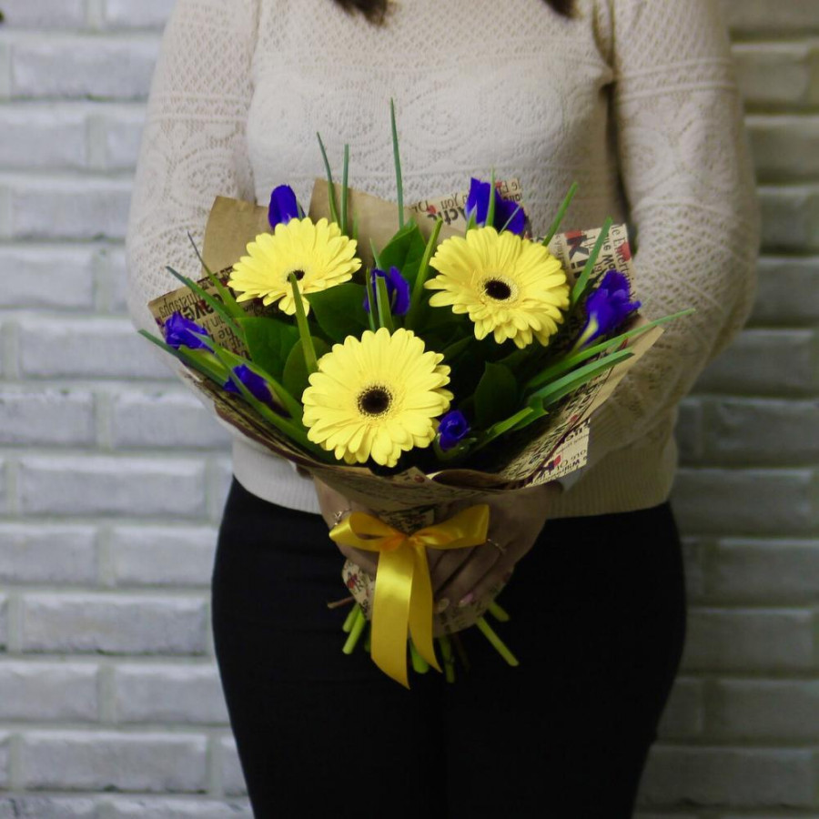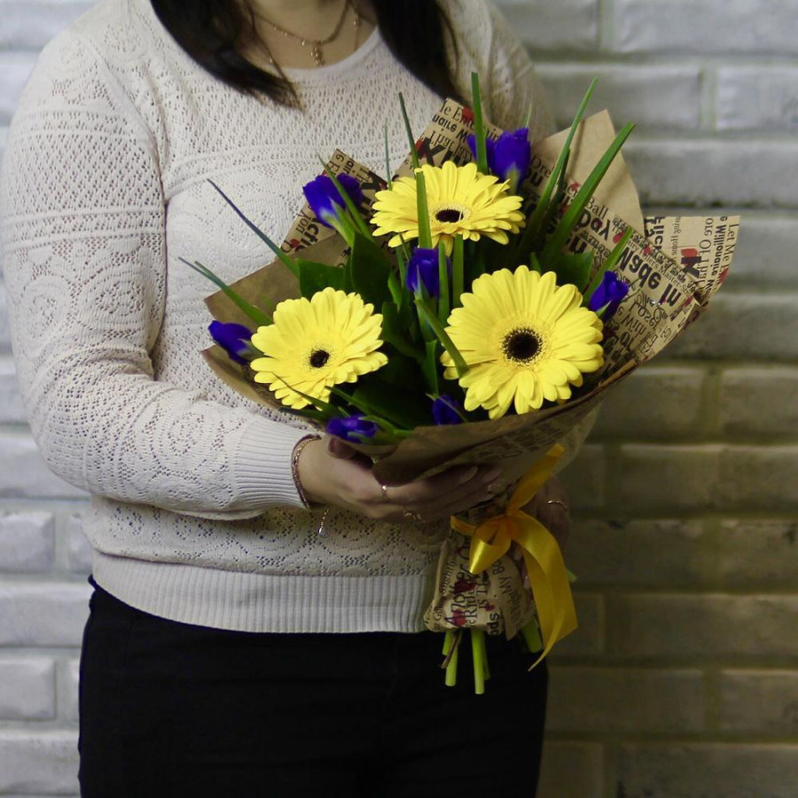 Букет из желтых гербер с синими ирисами в Курске