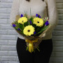 На фото букет из желтых гербер с синими ирисами. В составе: ирис 8 шт, гербера 3 шт, салал 1 шт, крафт-бумага 1 шт, атласная лента 1 шт, . Все цветы свежие и ароматные, букет красиво оформлен и отлично подходит для подарка. Доступна доставка цветов или самовывоз.
