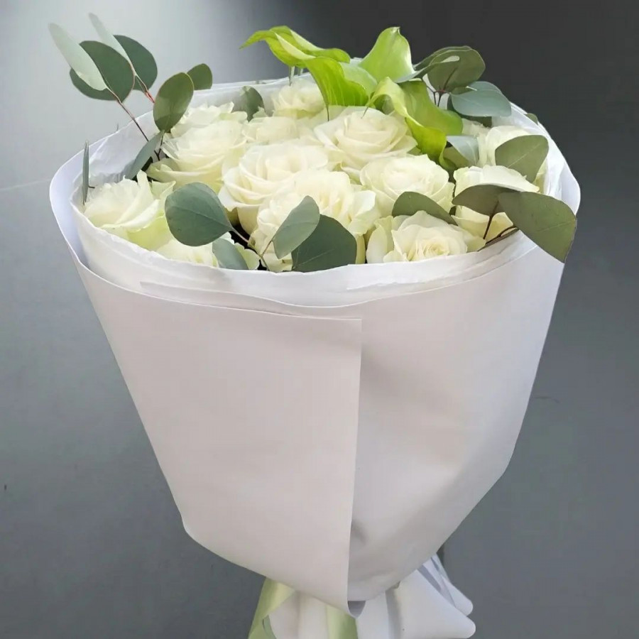 На фото букет из калл и роз. В составе: роза 15 шт, калла 2 шт, эвкалипт 2 шт, крафт-бумага 1 шт, ваксфлауэр 1 шт, . Все цветы свежие и ароматные, букет красиво оформлен и отлично подходит для подарка. Доступна доставка цветов или самовывоз.