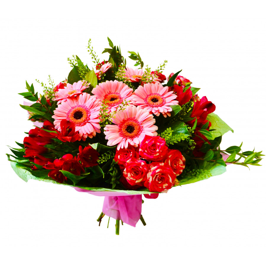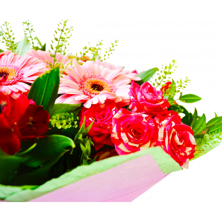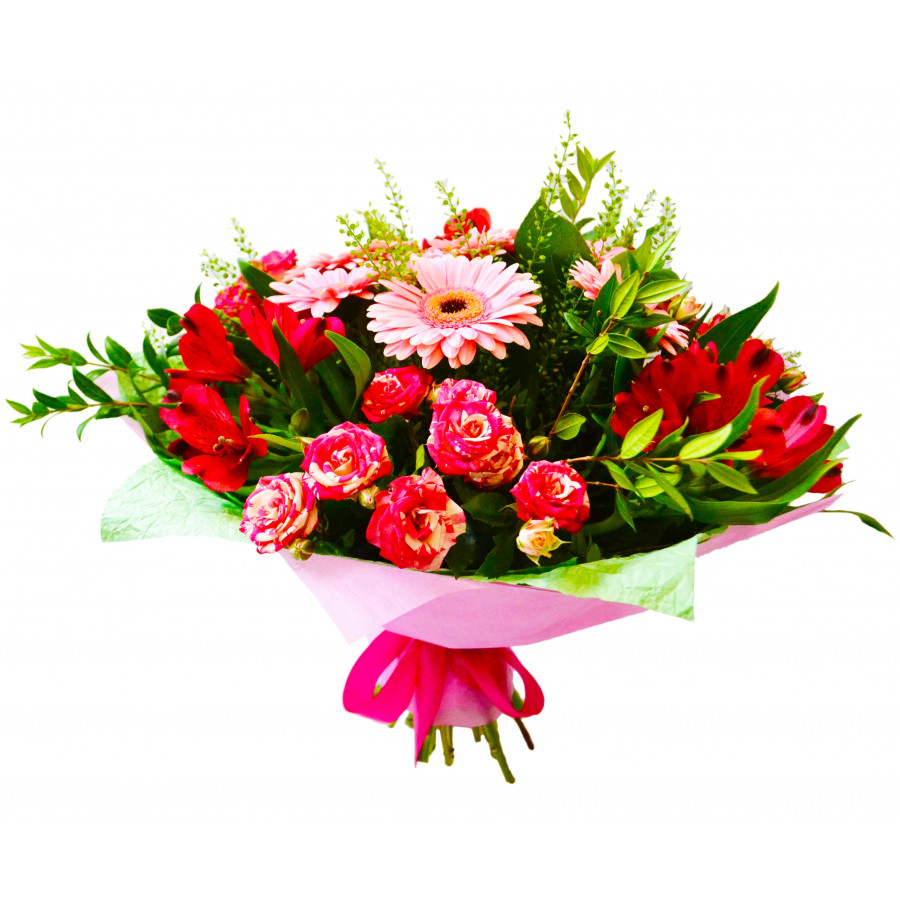 Яркий букет из огненных альстромелий, гербер и кустовых роз станет прекрасным подарком, если Вы хотите выразить Ваши бушующие чувства к получательнице. Дерзкие яркие цвета станут отражением старсти и любви, а великолепные цветы еще долго будут заставлять красавицу думать о Вас.
