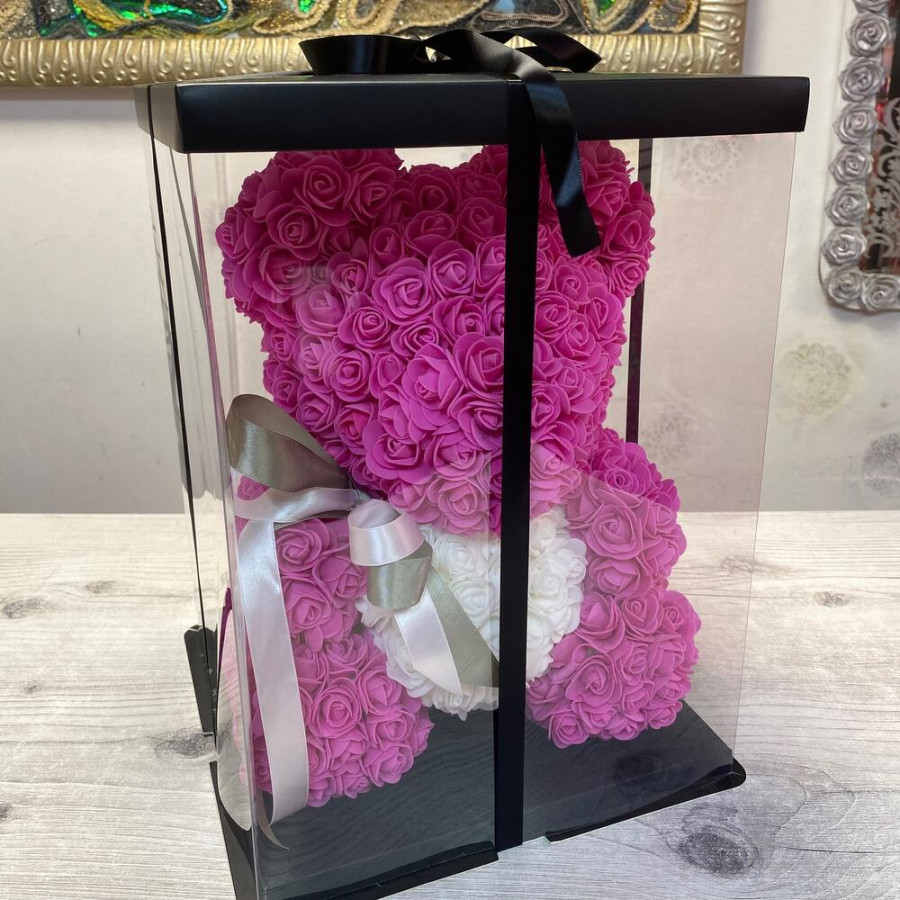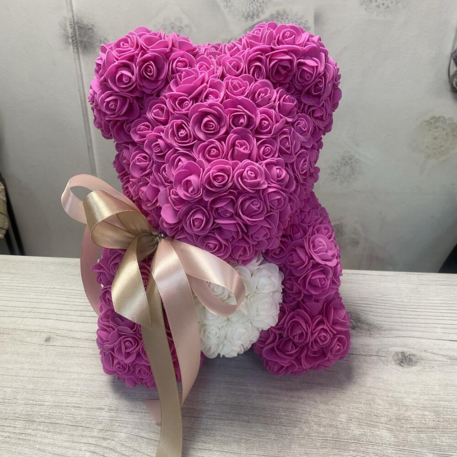 На фото мишка из роз «розовый». В составе: . Все цветы свежие и ароматные, букет красиво оформлен и отлично подходит для подарка. Доступна доставка цветов или самовывоз.